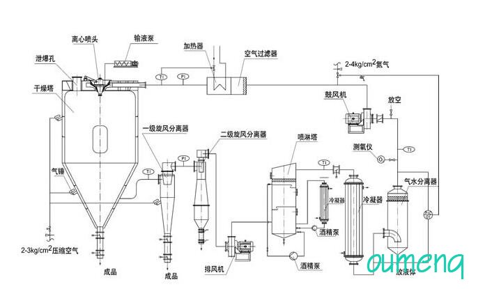 設備主要由:送料系統(tǒng)、加熱系統(tǒng)、霧化系統(tǒng)、噴霧干燥系統(tǒng)、惰性氣體循環(huán)系統(tǒng)、產(chǎn)品回收系統(tǒng)、冷凝系統(tǒng)組成。